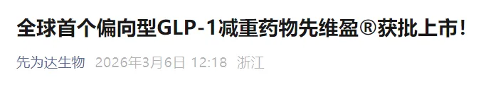 刚刚,杭州先为达生物宣布,全球首个cAMP偏向型GLP-1受体激动剂埃诺格鲁肽注射液(先维盈®)获得国家药品监督管理局(NMPA)批准上市,适用于在控制饮食和增加体力活动基础上对成人超重/肥胖患者的长期体重管理。