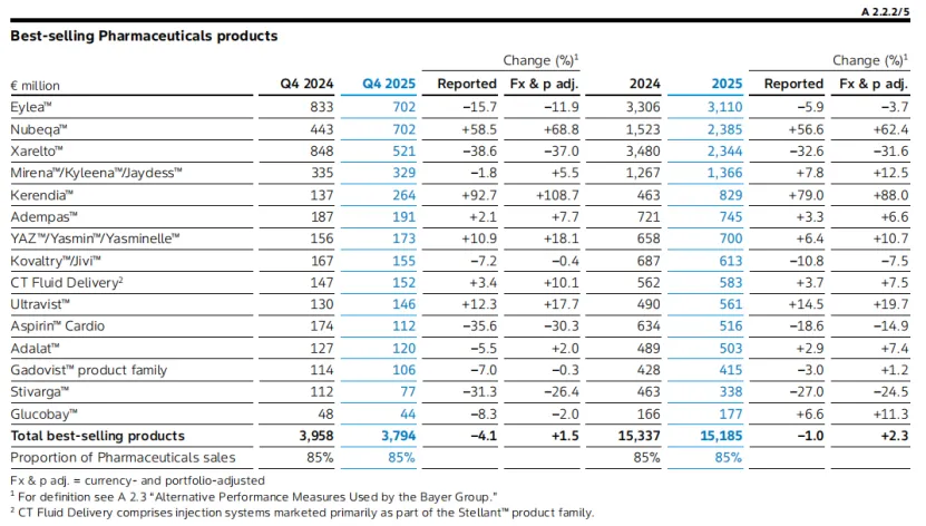 与增长产品形成鲜明对比的是,两款成熟产品正面临严峻的市场压力。由于生物类似药的进入,眼病治疗药物Eylea的销售在2025年下降了5.9%,至31.1亿欧元。Oelrich表示,竞争主要带来的是价格压力,尽管长效8mg剂型的销量有所增长,但难以完全抵消价格下滑的影响。拜耳预计,2026年Eylea的销售额将继续下滑20%至25%。