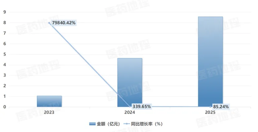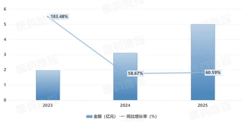 PDB药物综合数据库显示,2023年至2025年间,Nubeqa在国内院端市场销售规模稳步攀升,从2023年的约2亿元,以高两位数增幅快速放量,至2025年已突破5亿元。与此同时,Kerendia的增长势头更为迅猛,三年间销售额实现跨越式增长,从2023年的1亿元跃升至2025年超过6亿元,增幅高达8倍。