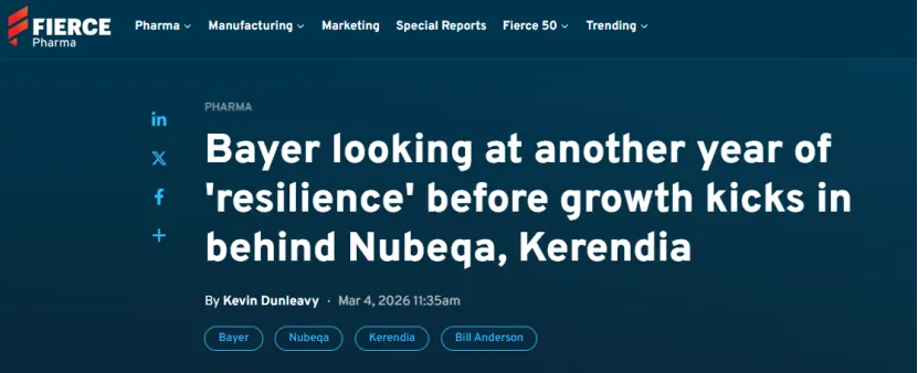 Oelrich预计,在成熟产品的拖累下,2026年拜耳的“基础业务将出现温和收缩”,但下半年销售额有望超越上半年。他表示,今年将是Nubeqa和Kerendia推出后的最后一年“韧性期”,到2027年,为公司将实现中等个位数增长。