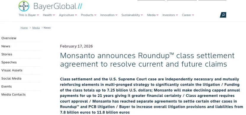 2018年,拜耳斥资630亿美元收购美国孟山都公司,获得其主打产品除草剂农达。后来农达因其核心成分草甘膦被指控可能致癌,在全球面临超过10万起诉讼。为此拜耳于2026年2月17日宣布同意支付高达72.5亿美元的和解金,这在清除了最大的法律障碍的同时也让公司短期内面临现金流压力。为此,其2025年年度业绩发布也推迟了一周。
