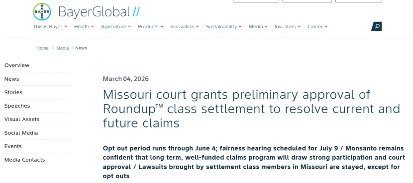 刚刚过去的3月4日,美国密苏里州法院初步批准了拜耳关于农达除草剂的集体诉讼和解协议,接下来,符合条件的索赔人可在6月4日前选择退出和解,法院计划于7月9日举行听证会以决定是否批准该方案。