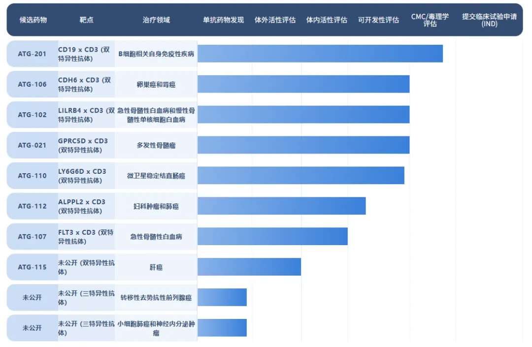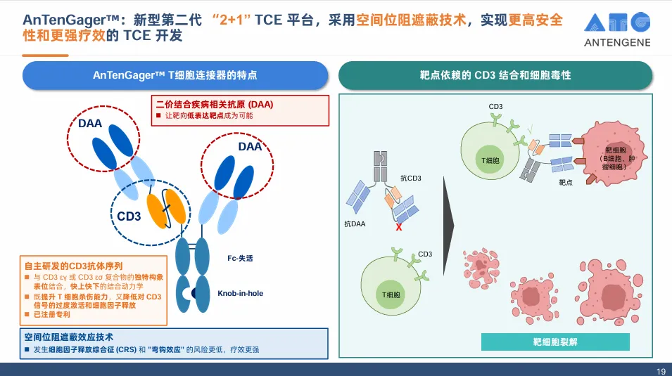 更关键的是,ATG-201背后是代表了TCE 2.0未来的AnTenGager™平台,除了空间位阻遮蔽技术,该平台还融合了自主研发的具有快速结合/解离动力学的CD3序列,进一步降低CRS风险。ATG-201计划于2026年第一季度在中澳两地提交IND,并完成I期临床研究。