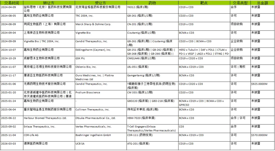 2024年,Candid Therapeutics一天内与包括岸迈生物、嘉和生物在内的多家中国药企达成三笔TCE研发合作,总潜在交易额超过13.2亿美元;不到半年后,又与药明生物达成三特异性自免TCE合作,妥妥的中国TCE“扫货王”。