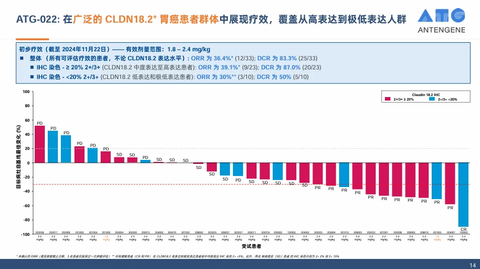 作为德琪ADC领域的门面担当,ATG-022在晚期实体瘤的临床研究中,不仅展现出针对胃癌等高表达患者的疗效,其在CLDN18.2低表达患者中也观察到了令人惊喜的抗肿瘤活性,客观缓解率(ORR)达28.6%。