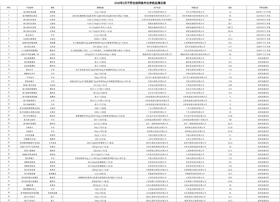 同期,河北还公示了2026年2月份挂网药品审核结果,104个化学药品未通过审核,包括布洛芬胶囊(10g/支×1支/支)、盐酸左氧氟沙星胶囊(0.2g(以C18H20FN3O4计)×12粒/盒)等。