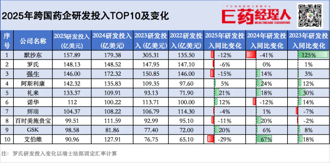 礼来在榜单里“独树一帜”。礼来2025年研发投入133.37亿美元,同比大增21%,是Top10公司里,唯一增幅超过20%的。