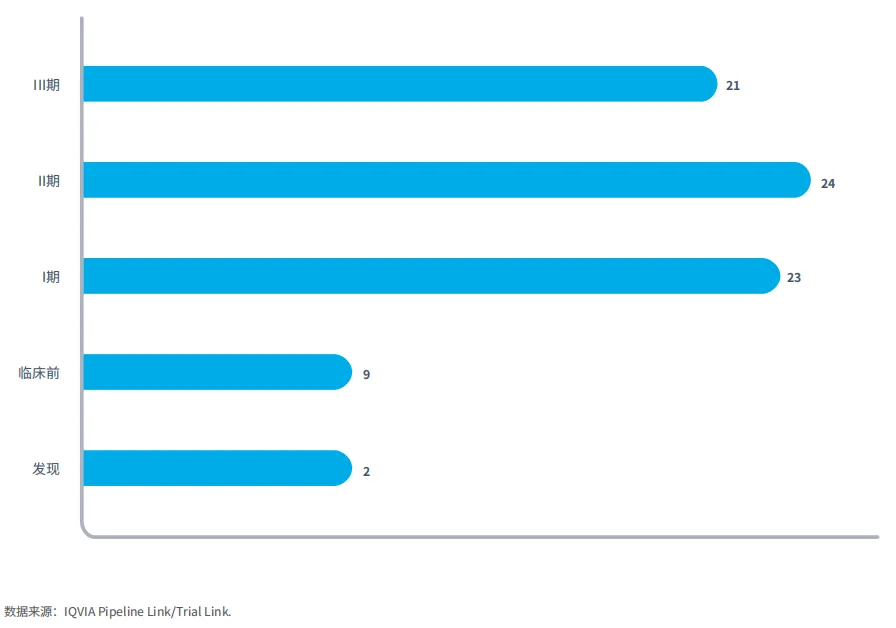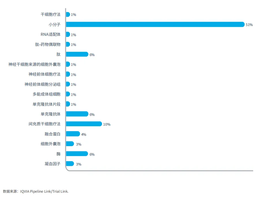 研发管线以小分子药物(51%)为主,其次是间充质干细胞疗法(10%)(图2),这得益于其已证实的疗效、可扩展性和在监管方面的丰富经验。这一趋势表明行业正朝着精准医疗方向转变。