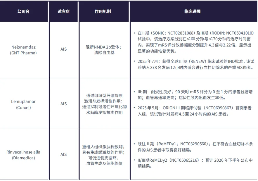 GNTP的nelonemdaz、Corxel的lemuplamor以及Diamedica的rinvecalinase alfa(DM199)均在中风发作后12‒24小时的延迟治疗时间窗内展现出具有前景的II期临床试验结果,具有促进血液循环和抗炎的双重作用。