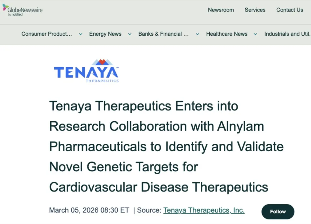 Tenaya首席执行官Faraz Ali表示:“通过将我们不分技术路线的靶点识别与验证能力,与Alnylam在RNAi疗法领域的领导地位相结合,我们有望推进针对新型遗传靶点的候选药物,为心脏病患者创造变革性药物。”