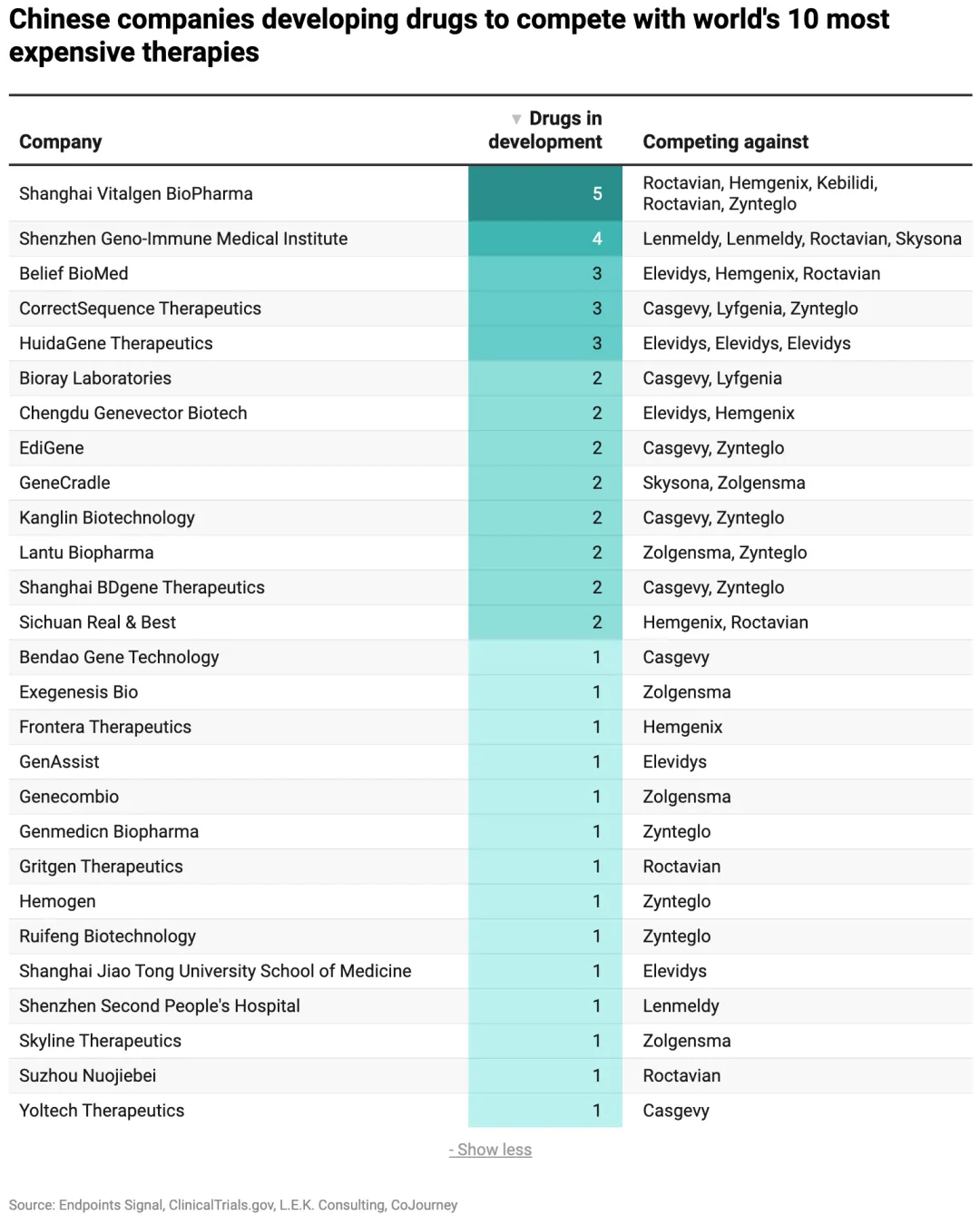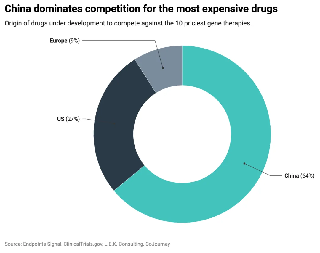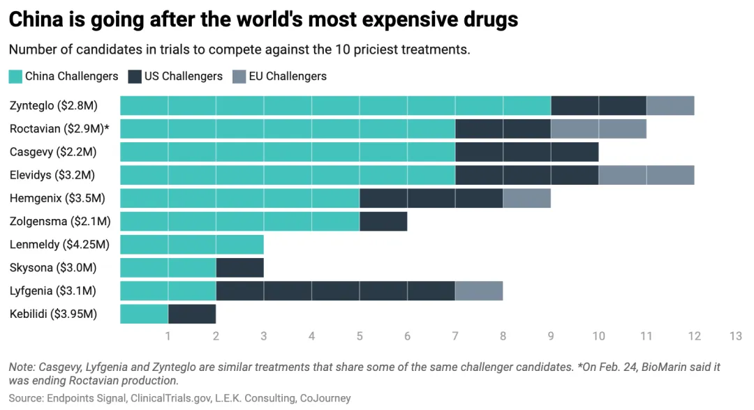 Zynteglo(每次治疗费用280万美元)、Elevidys(每次320万美元)、Roctavian(每次290万美元)和Casgevy(每次220万美元)都面临着至少七家中国竞争对手的挑战。Lenmeldy(425万美元)是榜单上最昂贵的疗法,其竞争对手全部来自中国,而美国和欧洲暂无同类竞品。