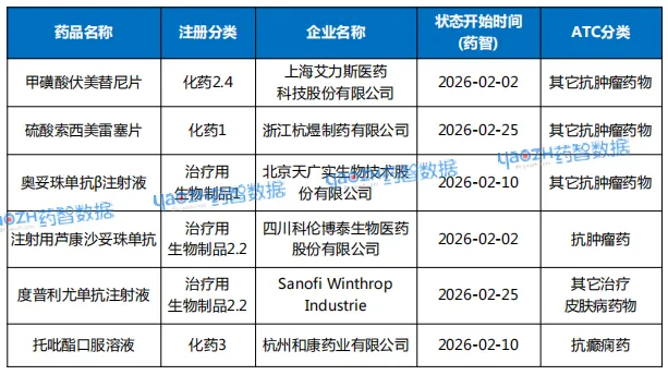 2月有6个品种通过优先审评获批上市,体现了药品审评审批制度对临床急需药品、创新药物的政策倾斜。这些药品主要集中在抗肿瘤、皮肤病、神经系统疾病等领域,均为临床急需或具有显著临床价值的药物。