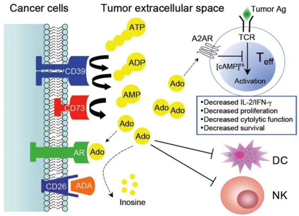 在正常生理状态下,CD73与另一个胞外酶CD39(NTPDase1)协同构成"腺苷能级联":CD39先将胞外ATP/ADP水解为AMP,再由CD73将AMP转化为腺苷。CD73的主要功能是与CD39协同将胞外ATP转化为具有免疫抑制活性的腺苷,在正常组织中用于限制过度免疫反应。这就是核心所在,它能够产生免疫抑制活性的物质。