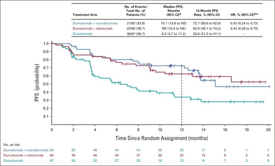 后面临床II期的COAST研究治疗NSCLC,验证了该药联用度伐利尤单抗疗效是好于度伐利尤单药的:durvalumab+MEDI9447组的ORR为30.0%,durvalumab单药组为17.9%。与durvalumab单药相比,联合治疗组均显示了数值上更高的ORR和更长的PFS,且无新的重要安全信号。从PFS的图像来看,确实很不错,HR达到了0.44,且中位PFS长于15个月,远高于度伐利尤单抗的6.3个月。