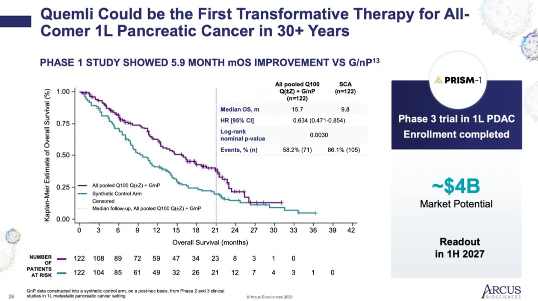 Biosciences处买来的,当时二者签署了为期10年的合作协议,1.75亿美元首付款+2亿股权投资,目前出了些临床数据,比如胰腺癌,一期临床联用的OS达到了15.7个月,HR达到了0.63。现在该药物正准备开一线治疗胰腺癌的临床三期数据。但是从临床三期的结束时间来看挺离谱,2030年临床三期才完成。