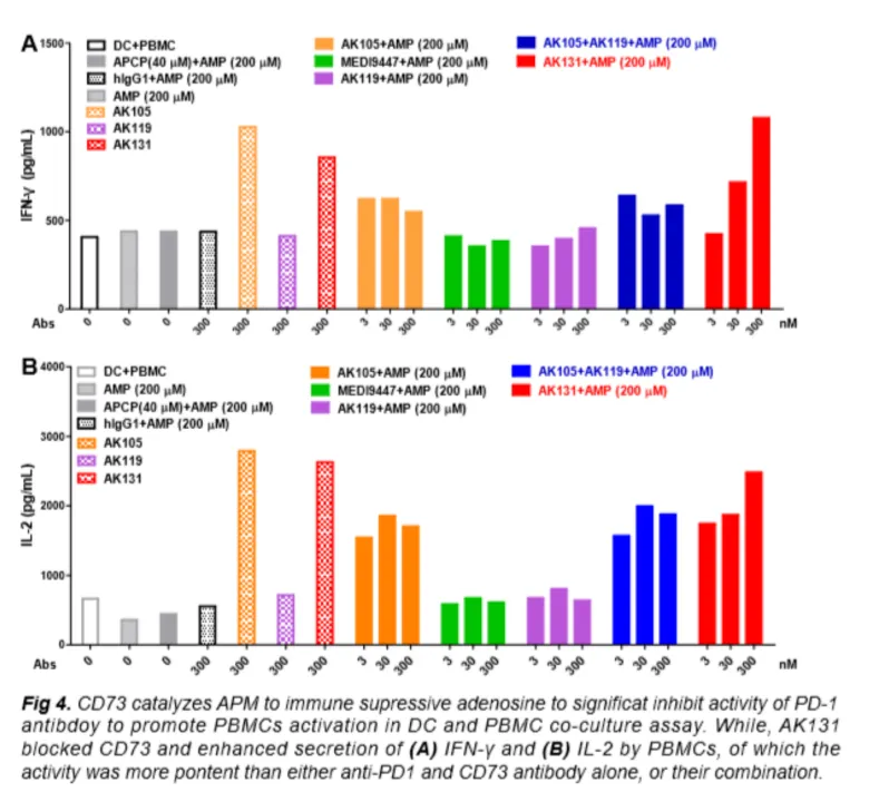 此外,康方虽然停了它的AK119,但是康方的AK137和AK131仍然在推进,前者为PD-1×CD73双抗,后者为LAG3×CD73双抗。以AK131为例,如图所示,AK131可同时抑制CD73和PD-1通路,因此其较PD-1单抗单药,以及PD-1和CD73单抗联合用药展示了更强的免疫激活药效,诱导了更强的IFN-γ和IL-2的分泌。