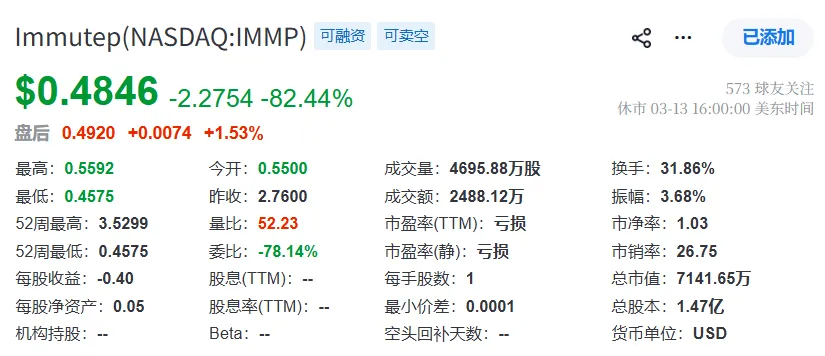 受此消息影响,Immutep股价暴跌82.44%,每股跌破1美元,报0.48美元/股。截止日前,总市值为7141.65万美元。