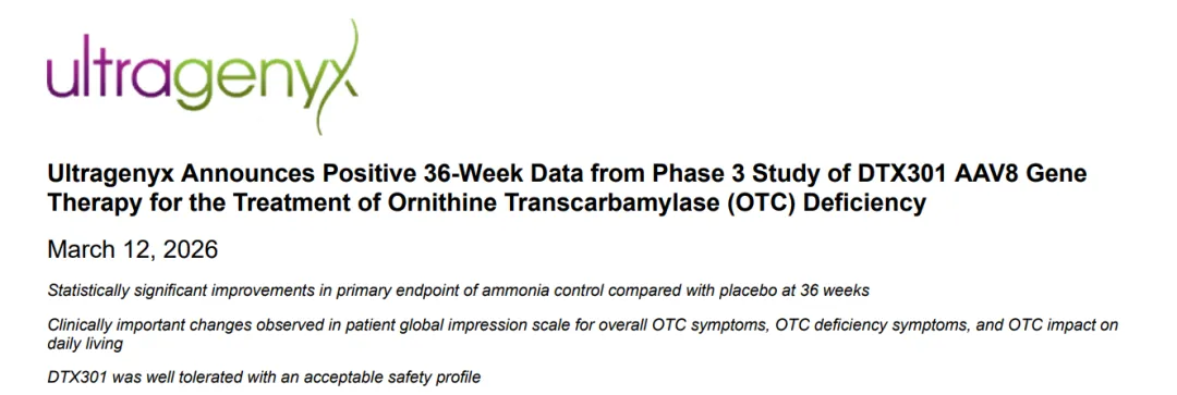 ontaparvovec)是一款在研AAV8型基因疗法,旨在通过单次静脉输注实现OTC的稳定表达和活性。临床前研究显示,该疗法可使尿乳清酸水平(血氨代谢标志物)恢复正常。DTX301已在美国和欧盟获得孤儿药资格认定,并在美国获得快速通道资格认定。