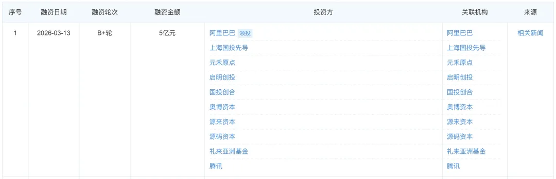 企查查数据显示,本轮融资由阿里巴巴领投,源来资本、奥博资本、元禾原点、启明创投、礼来亚洲基金、源码资本国内知名投资机构参与,腾讯也作为投资方名列其中。