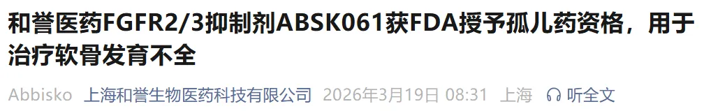 3月19日,和誉医药宣布,其自主研发的高选择性小分子FGFR2/3抑制剂ABSK061已获得美国食品药品监督管理局(FDA)授予的孤儿药资格(ODD),用于治疗软骨发育不全(ACH)。此前,ABSK061曾获得FDA罕见儿科疾病(RPD)资格认定。