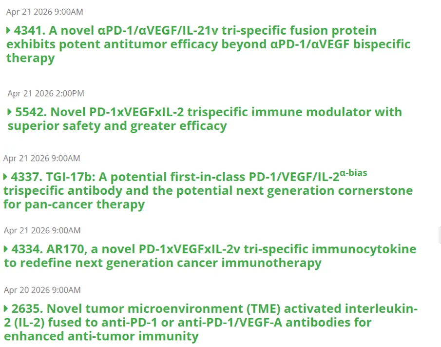 当前,下一代肿瘤免疫疗法的支柱之一是PD-1(L1)/VEGF双抗,另一大方向则是信达首创的PD-1/IL-2细胞因子疗法IBI363。将两者结合,成为最值得期待的PD-1(L1)/VEGF“继承者”之一。本次AACR会议期间,共有5款PD-1(L1)/VEGF相关的细胞因子疗法披露。