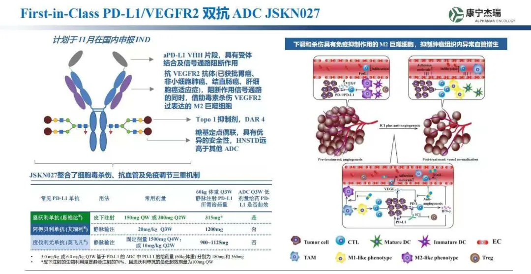 基于VEGF和PD-L1的特定表达,另辟蹊径的ADC开发也成为越来越常见的尝试。去年多禧生物的PD-1/VEGF双抗ADC已初试啼声,今年康宁杰瑞的PD-L1/VEGFR2双抗ADC则已快速进入临床阶段。