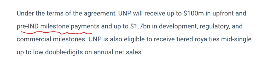 根据协议,UNP 将获得最高 1 亿美元预付款及 IND 前里程碑付款(pre-IND milestone payments),另可获最高 17 亿美元开发、监管与商业化里程碑付款,以及基于年度净销售额的中个位数至低两位数分层特许权使用费Royalty。