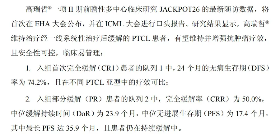 迪哲医药在2025 EHA年会和18-ICML上公布了全球首创新药戈利昔替尼针对经一线系统性治疗后缓解的外周T细胞淋巴瘤(PTCL)维持治疗的长期随访数据,显示有望维持并增强抗肿瘤疗效,且安全性可控,临床易管理。