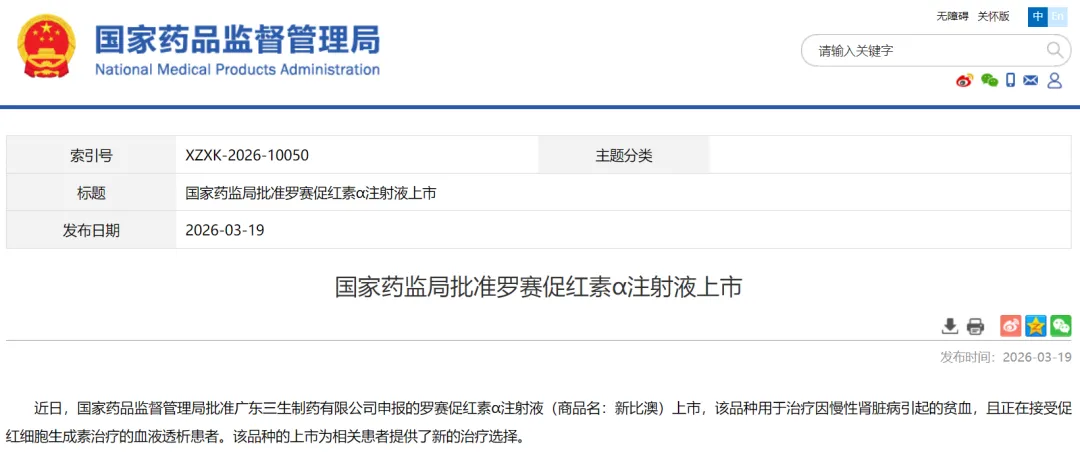 2026年3月19日,中国国家药品监督管理局官网公示,三生制药自主研发的1类生物创新药罗赛促红素α注射液(商品名:新比澳)正式获批上市,用于治疗因慢性肾脏病引起的贫血且正在接受促红细胞生成素治疗的血液透析患者。