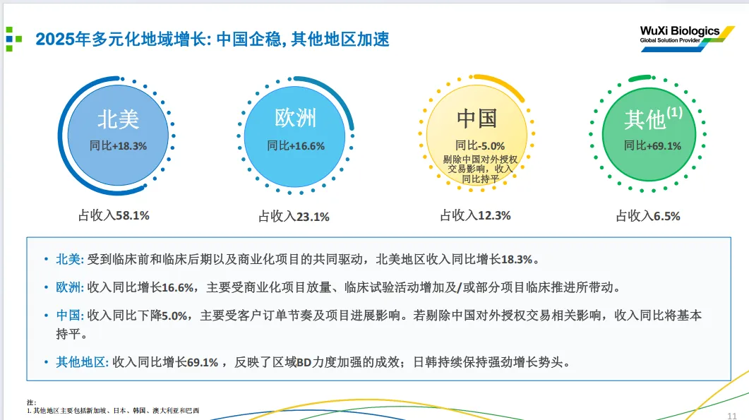 (2)中国市场阶段性波动,核心基本盘企稳无虞。中国区收入同比小幅下滑 5%,但并非核心业务基本面恶化:下滑主因是客户订单节奏、项目进展的阶段性影响,以及一次性对外授权交易的基数扰动;剔除该一次性非经常性因素后,本土收入同比持平,完全契合材料中 “中国企稳” 的定调。