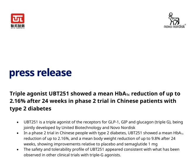 3月25日,诺和诺德和联邦制药共同宣布UBT251的中国降糖II期研究取得了积极结果。