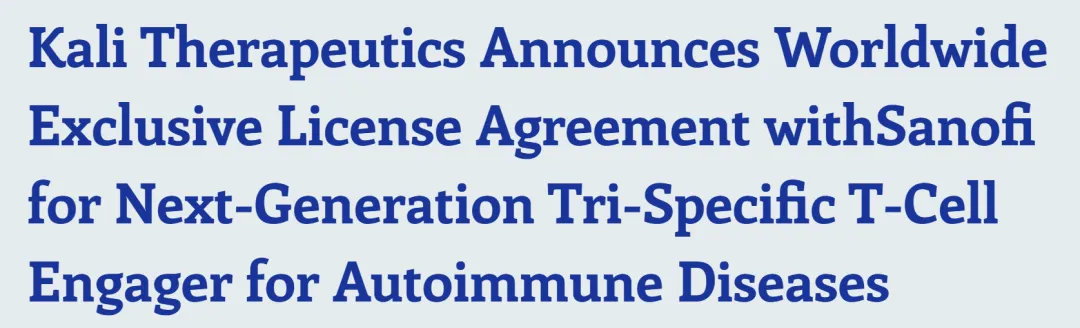 3月23日,Kali Therapeutics宣布已就一款三特异性抗体(KT501)与赛诺菲达成一项许可协议。根据协议条款,赛诺菲将获得 KT501的全球独家权益。Kali Therapeutics将获得1.8亿美元首付款及近期付款,并有资格获得总计高达 10.5 亿美元的开发及商业化里程碑付款,以及产品的销售版税。
