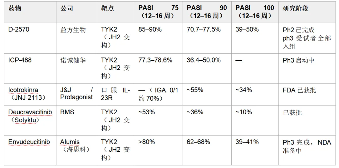 当然,Ph2数据可能存在高估效应(样本量小、入组偏积极),直接与国际Ph3数据类比需保持克制。但这些数字至少说明:中国TYK2管线在疗效端的上限,可能远比市场预期的更高。