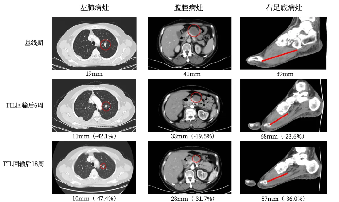 TIL临床试验,2025年初完成回输。回输18周后,左肺、腹腔、右足底病灶分别缩小47.4%、31.7%、36.0%,整体评估为部分缓解(PR),身体状态大幅好转,重新恢复行走能力。