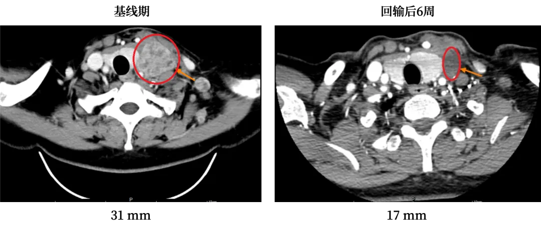 回输后6周,首次疗效评估就让人振奋:整体靶病灶缩小31.9%,其中62mm的最大单病灶缩小近40%,达到部分缓解(PR)。更让人安心的是,他仅出现寒战、发热等轻微不良反应,对症处理后快速恢复,没有出现任何严重不适。