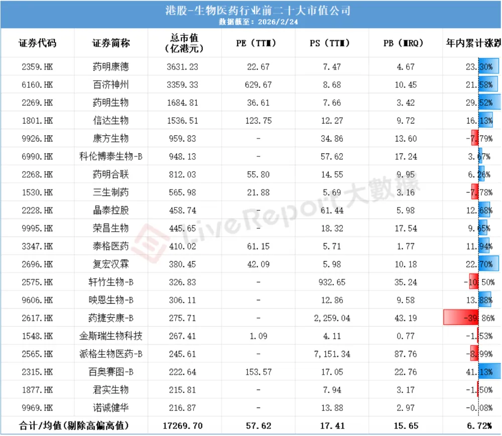 据统计,2026年2月,港股年内前二十大生物医药公司平均PE(剔除极端值后)高达57.62倍,A股则为45.03倍,美股前二十大公司平均PE为32.66倍。这种估值差异,反映了市场对中国创新药企未来高成长性的预期,尤其是在ADC、双抗等前沿赛道,具备核心技术壁垒的企业更能获得全球资本的追捧。