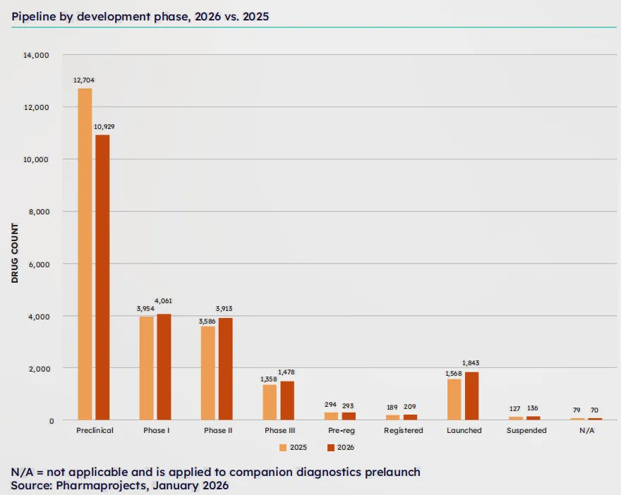 报告显示,截至2026年1月,全球在研药物总数降至22,940个,较上一年的23,875个下降3.9%。这是近三十年来,全球研发管线规模首次出现收缩。尽管统计口径调整被认为是部分原因,但一个更具确定性的信号已经浮出水面——