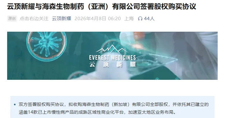 此前3月17日,云顶新耀与海森生物(亚洲)签署收购意向书,拟收购其新加坡标的公司100%股权。4月7日,云顶新耀全资新加坡子公司EverSea Medicines (Singapore) Pte. Ltd.与海森(新加坡)正式签署《购股协议》,敲定交易核心条款,包括总对价、支付节奏、先决条件、交割安排等核心内容。