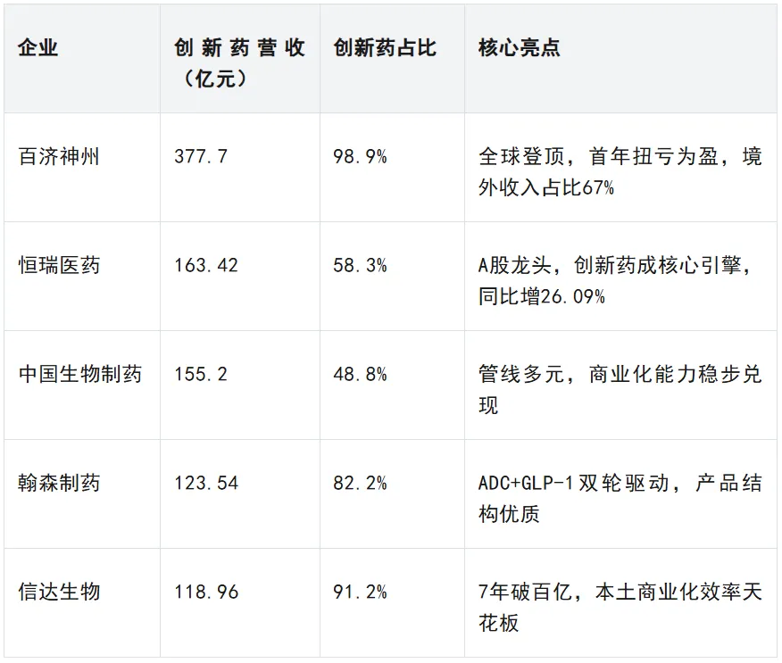 2025年,百济神州、恒瑞医药、中国生物制药、翰森制药、信达生物5家企业率先跨过创新药年营收百亿门槛,创下中国创新药发展史的全新纪录。