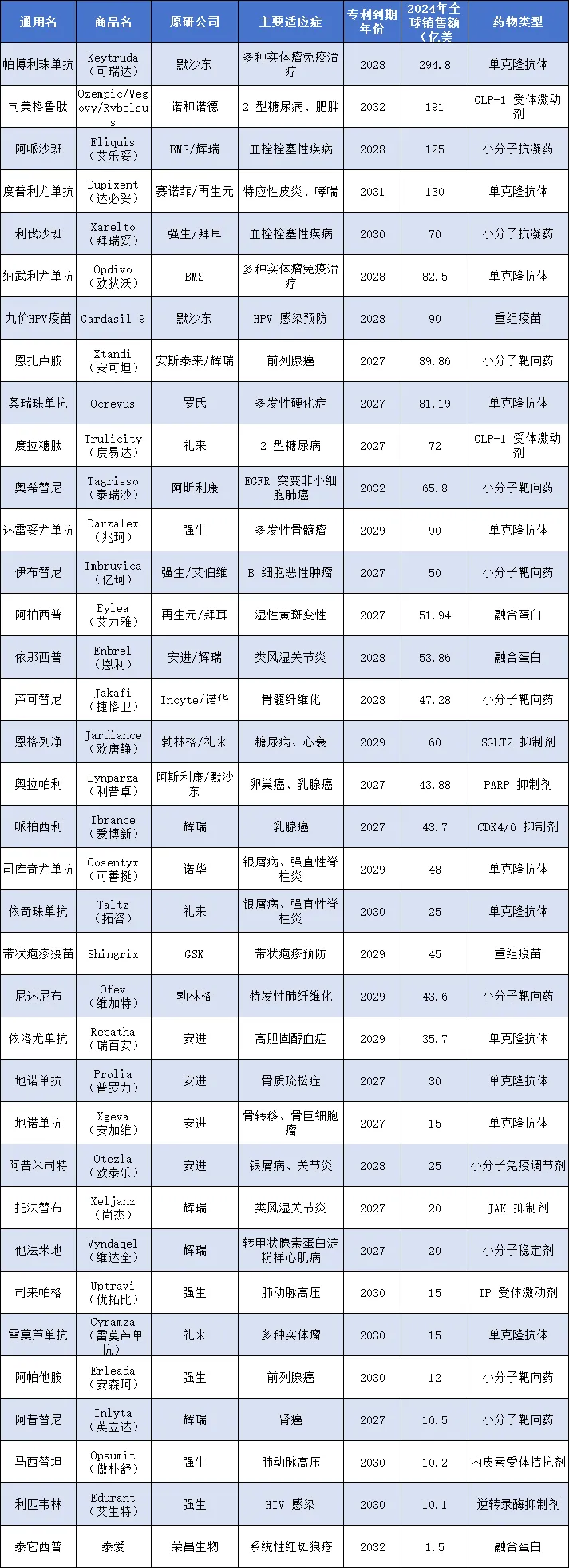 在这波专利到期潮中,不同治疗领域的明星药物将轮番登场,它们不仅是原研药企的现金牛,更是全球患者赖以生存的关键治疗手段。我们梳理了这一期间内目前公开可查的全部重磅创新药,涵盖了肿瘤、代谢、自身免疫等多个核心赛道。