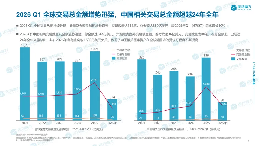 2026年第一季度,全球医药交易市场延续活跃态势,总交易金额达880亿美元。中国相关交易表现突出,总金额614亿美元,占全球总量近七成,且已超过2024年全年水平。中国医药产业国际化逻辑完成转型,创新药出海成果显著,全球TOP10交易榜单中中国相关企业占据6席,Top