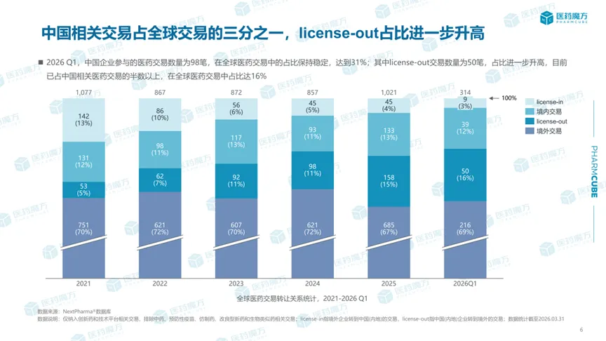 中国相关的医药交易数量在2026年第一季度占到全球交易数量的三分之一,这一占比在近五年间始终维持在30%以上,活跃参与全球交易。其中,License-out已成为驱动增长的关键力量,交易数量达到50笔,占中国相关交易总量的半数以上,在全球医药交易中的占比也从2021年的5%跃升至16%。这不仅标志着中国创新药企业从“引进来”向“走出去”的战略转型成效,中国原研成果的国际认可度持续提升,更意味着中国正从全球医药创新的追随者加速转变为全球价值链重构的重要共建者。