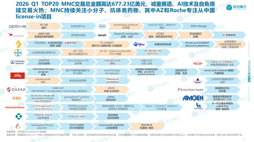 MNC更倾向于围绕已验证的作用机制进行垂直整合,而中国等新兴市场的创新资产在全球并购版图中的战略地位正持续提升。