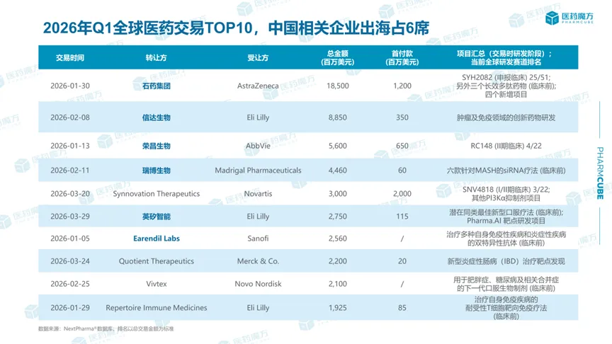 2026年Q1全球医药交易TOP10榜单中,中国相关企业占据6席,其中石药集团向阿斯利康转让长效多肽药物SYH2082等项目,总金额185亿美元位列榜首;信达生物与礼来合作肿瘤及免疫创新药(88.5亿美元)、荣昌生物向艾伯维转让RC148(56亿美元)分列二、三位。其余上榜交易包括瑞博生物向Madrigal授权MASH