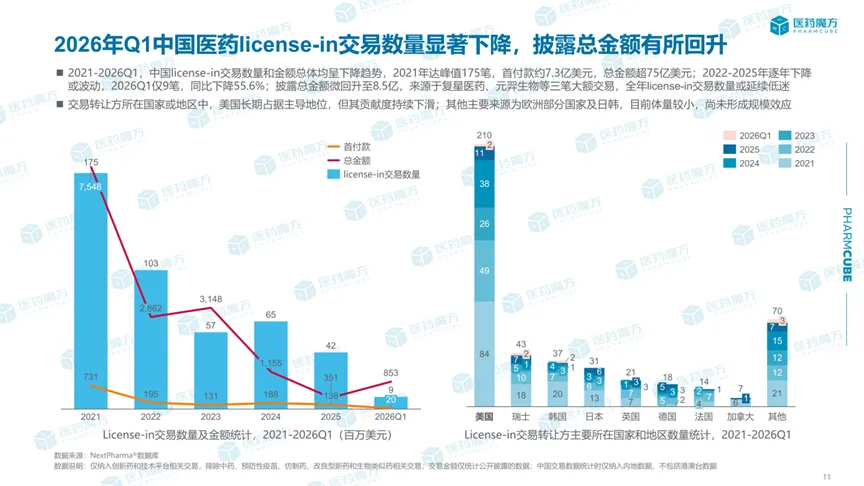 2021年至2026年第一季度,中国医药License-in交易呈现数量持续收缩、金额微幅波动、结构显著调整的趋势。2021年该领域交易达峰值175笔,总金额超75亿美元,此后逐年下降或波动,至2026年Q1仅9笔,同比减少55.6%,但披露总金额微幅回升至8.5亿美元,主要源于复星医药、元羿生物等三笔大额交易,其中复星医药从AriBio引进已上市药物米罗那非,总金额4.24亿美元,全年交易数量或延续低迷态势。