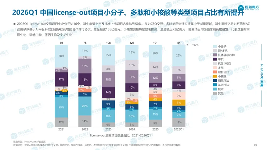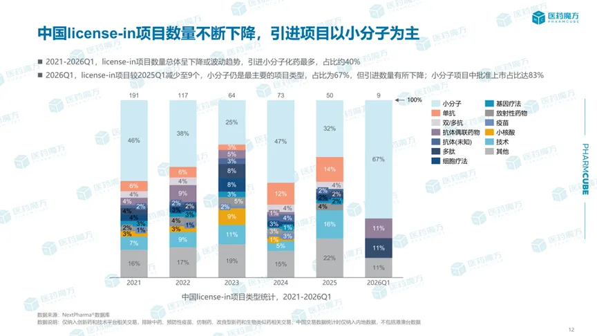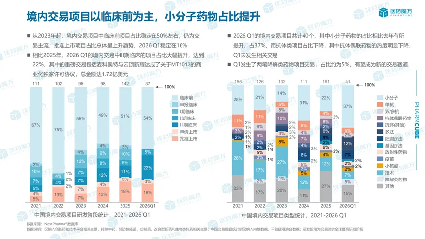 从项目类型与研发阶段看,小分子药物和临床前项目仍是境内交易主流。2026
