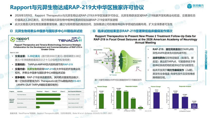 Therapeutics就RAP-219达成的大中华区独家许可协议,成为当季具有代表性的跨境合作案例。本次交易总规模达3.28亿美元,权益覆盖中国内地及港澳台地区,适应症聚焦局灶性癫痫发作与双相情感障碍躁狂相。RAP-219作为一款潜在同类首创的TARPγ8特异性AMPA受体负向别构调节剂,其差异化机制体现在精准靶向特性上。由于TARPγ8仅高表达于海马、新皮层等局灶性癫痫起源脑区,而在后脑表达较低,该药物有望在提升疗效的同时降低传统神经系统药物的不良反应风险。临床数据显示,其IIa期试验针对难治性局灶性癫痫取得积极结果,患者癫痫发作频率中位数下降77.8%,24%受试者在8周治疗期内实现无发作,且安全性总体可控,多数不良事件为轻中度。基于该机制在多类神经系统疾病中的潜在应用价值,双方正评估其在双相情感障碍等领域的拓展可能。