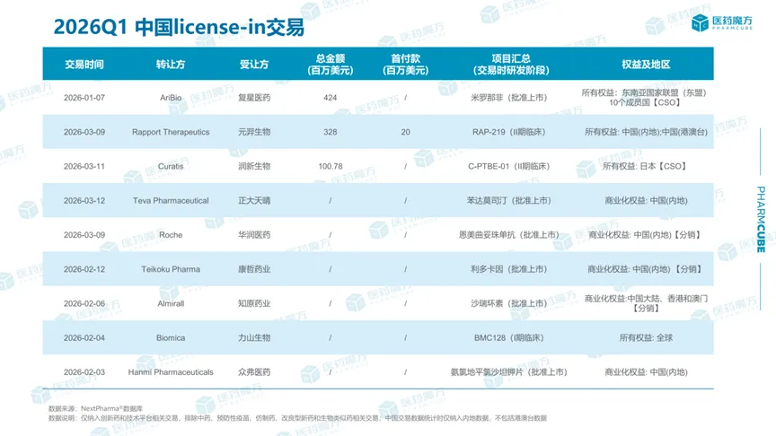 2026年第一季度中国License-in交易涉及AriBio、Rapport
