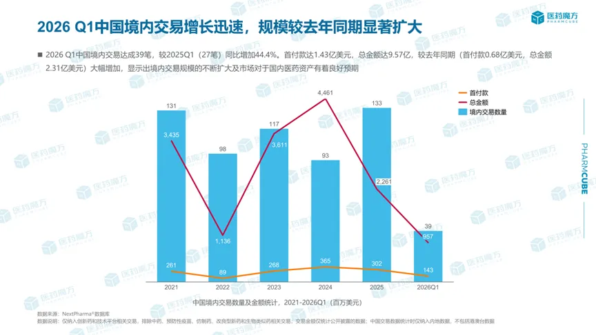 近年来,中国境内医药交易增长迅速,交易规模显著扩张,市场对中国医药资产的预期稳步提升。据医药魔方NextPharma®数据库统计,当季境内交易数量达39笔,同比增加44.4%,交易总金额达9.57亿美元,交易数量与金额较2025年同期均实现大幅增长,反映本土交易活跃度与资产价值认可度的双重提升。