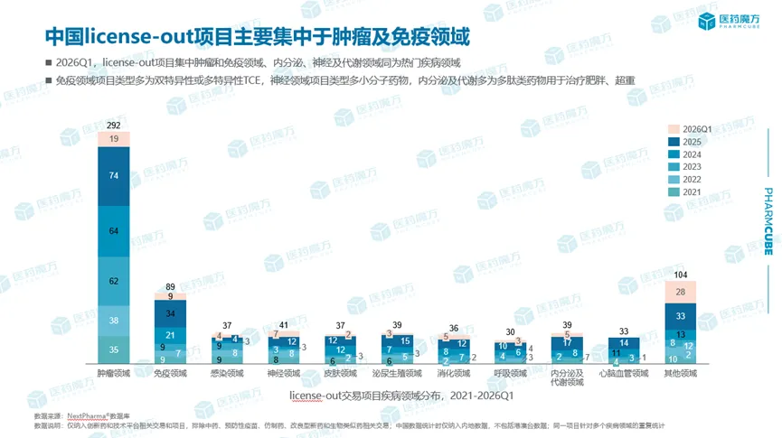 项目研发阶段呈现显著的两极化特征。2026Q1临床前项目与已批准上市项目合计占比75%,集中于小核酸、抗体类药物及口服多肽等前沿领域,既反映源头创新受国际追捧,也凸显成熟产品的商业化价值。疾病领域则持续聚焦肿瘤与免疫双核心,2021-2026年第一季度肿瘤领域项目达292个,免疫领域89个,二者合计占总量超七成,同时减重、神经科学等新兴领域加速突破。